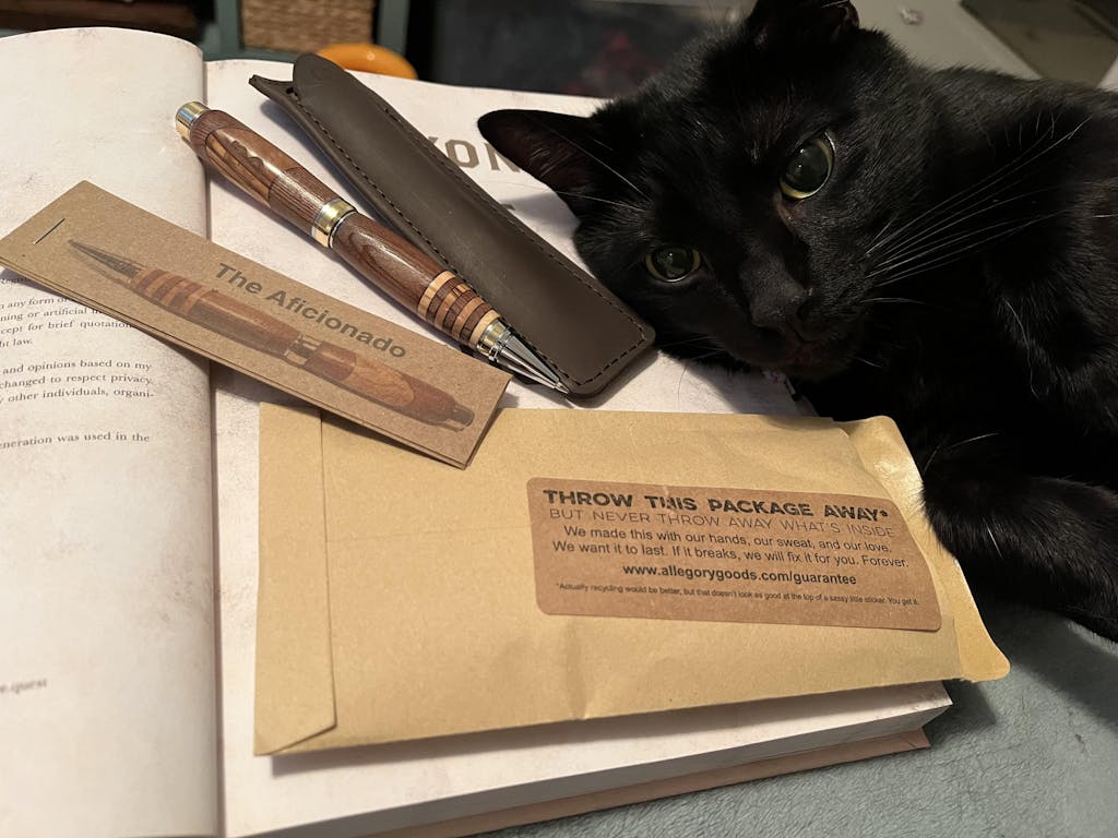 Made in the USA with reclaimed picklewood redwood and ancient Bethlehem olivewood, the Aficionado is a large-barreled, twist-style pen using standard Parker style refills.